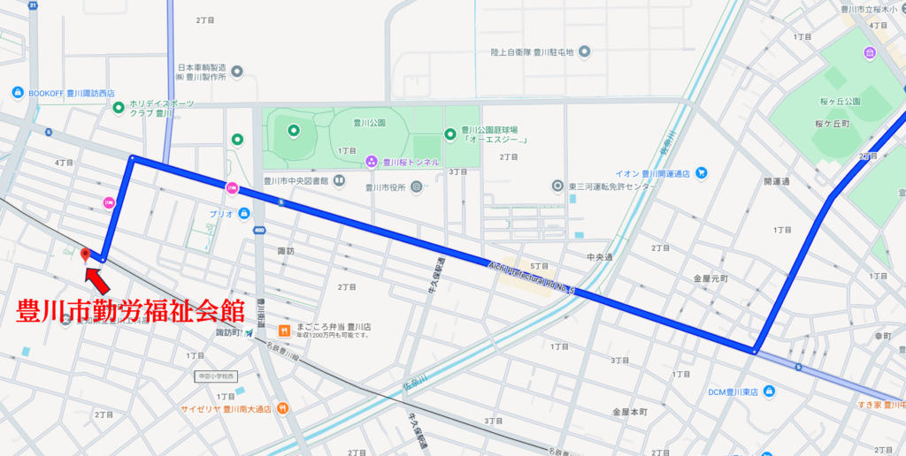 ⑦42m先の左側が豊川市勤労福祉会館の入口